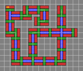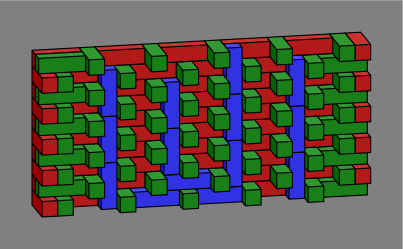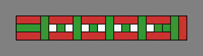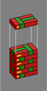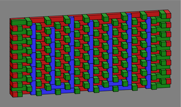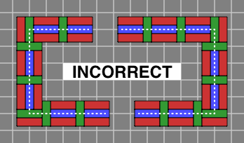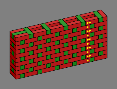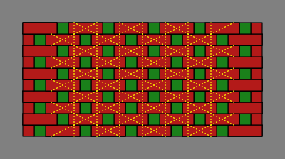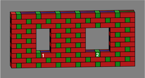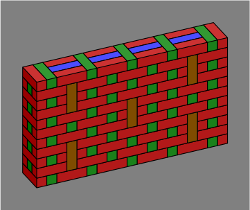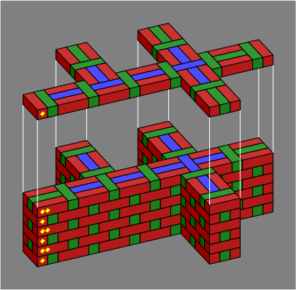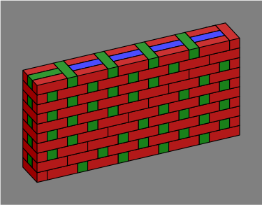 Bricks colored blue are entirely interior to the wall and might be omitted, depending on how strong the wall needs to be. Red and green bricks are mandatory, at least in an ordinary wall; one reason for their color difference is that it makes the diagrams easier to read, and another more subtle reason will be revealed in section 6 below. Although the red, green and blue coloration was adopted for technical reasons, it happens to suggest a decorative pattern for a wall built with multicolor bricks.