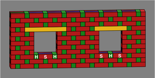 The bottom two courses (horizontal layers) are exploded to show their design in full. Bricks parallel to the length of the wall are stretchers, and are marked with the letter S in the bottom course, while perpendicular bricks are marked H for header. Each course is marked with one yellow diamond (for an odd course) or two (for an even course); these markings show how courses are repeated. There is no intrinsic difference between odd and even courses — rather, one course is arbitrarily declared odd, and the rest follow. Like most brick walls, this one has only two different courses, but a larger number is possible.