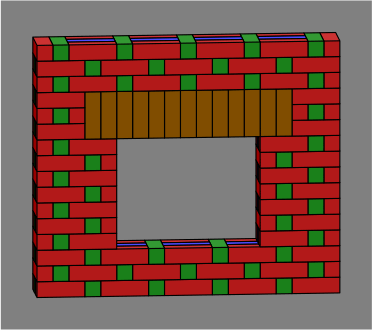 Figure 2C shows one way to arrange the vertical bricks. Red stretchers on the front of the wall have been removed from the drawing to allow viewing inside. Also, the angle of projection has been changed somewhat from that of figure 2A to reduce the apparent overlap of bricks.