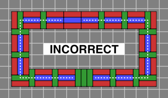 On the other hand, if the bricklayer needs to start with several disconnected sections and fill the gaps later, care is required to ensure that the disconnected sections arein phase, or they will not join properly. Figure 6B, which shows the odd course of a brick wall that is supposed to become a complete box, reveals what can go wrong. Each of the left segment and the right segment is correct in itself, but the two segments are out of phase with each other, and will not connect according to the rules of Flemish bond.