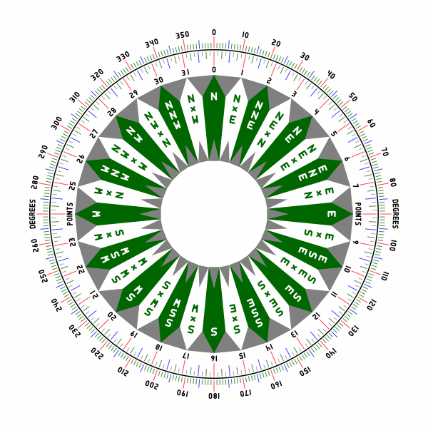 A 128-point compass card is shown below, as an augmentation of the 32-point card above. (pdf version)