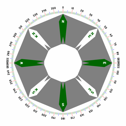 An eight-point compass card or compass rose shown below displays the eight directions mentioned so far; also included are bearings in degrees, which are often preferred in modern navigation. Like many charts, this one observes the custom (but not requirement) of showing north at the top. The diagram employs the abbreviations N, E, S, and W with the obvious meanings. See also a pdf version, in higher resolution.