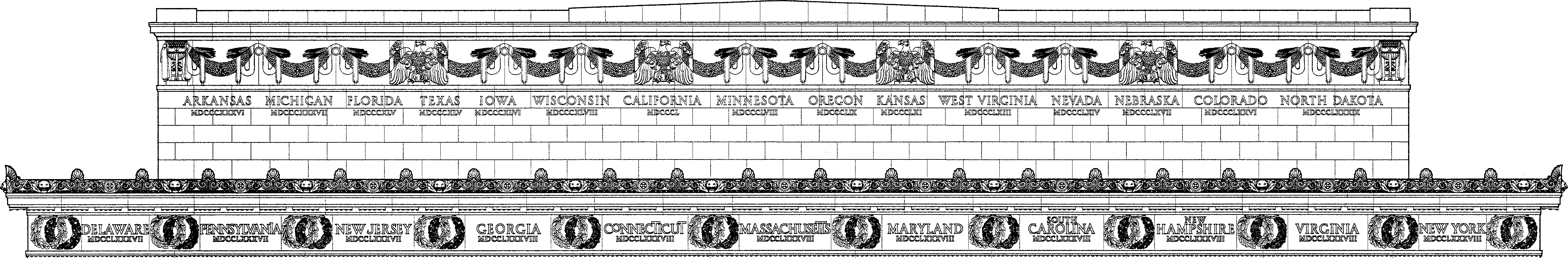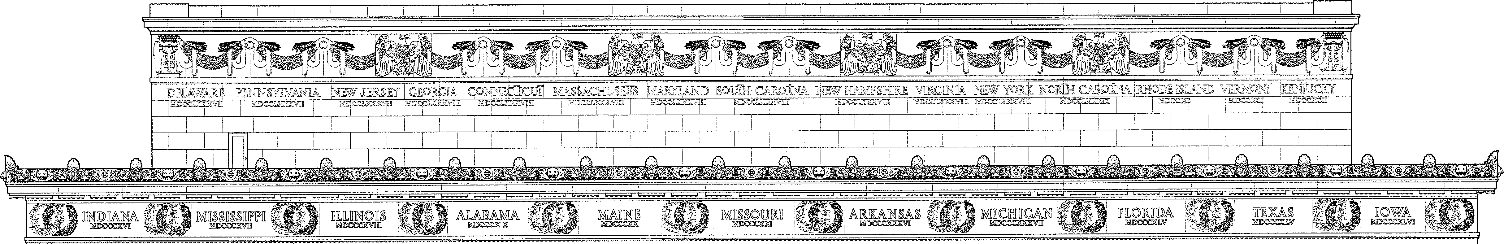 The structure is bounded by a colonnade. An entablature atop the 36 columns contains a frieze with the names of the 36 states that joined the Union before the end of the Civil War. Included are the states that seceded during that conflict, all of which ultimately returned.