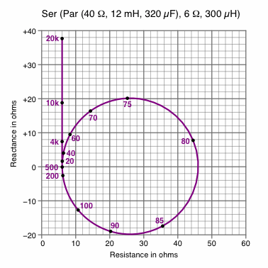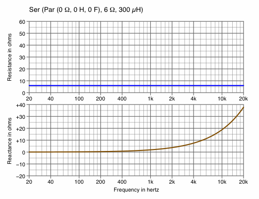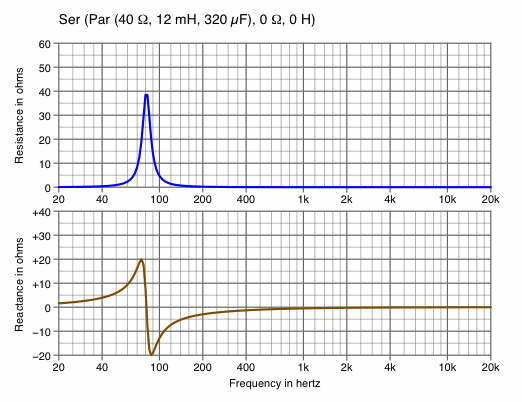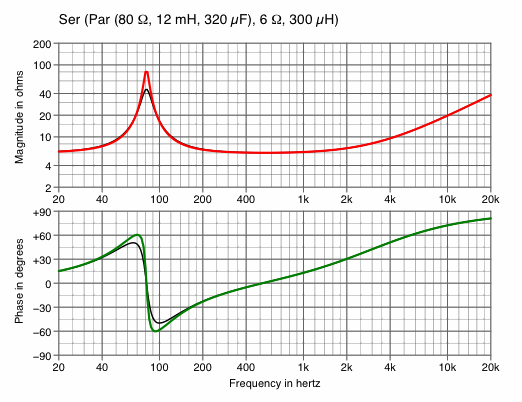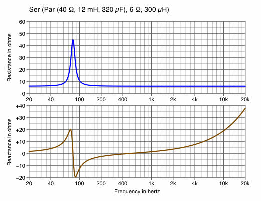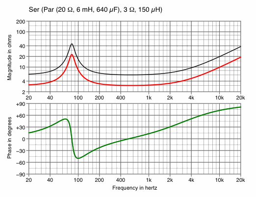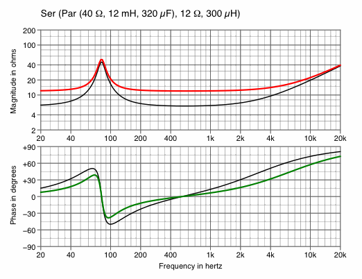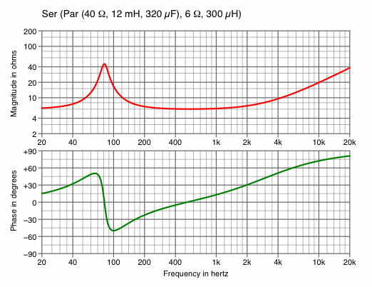 Such charts routinely include the magnitude of the complex impedance, but not the phase. It turns out that for dynamic speakers, the phase is roughly proportional to the derivative [w] of the magnitude, so at least the phase can be estimated. The phase of a dynamic speaker might lie anywhere between −90° and +90°, but amplifiers usually perform best when the phase is between −45° and +45°. Otherwise, the amplifier can be delivering substantial voltage and current, yet little power.The network Ser (Par (40 Ω, 12 mH, 320 μF), 6 Ω, 300 μH) was selected as a benchmark for comparison within this report because it approximates the electrical characteristics of a typical guitar speaker. Its impedance curves are displayed three different ways in charts 1A, 1B and 1C.
