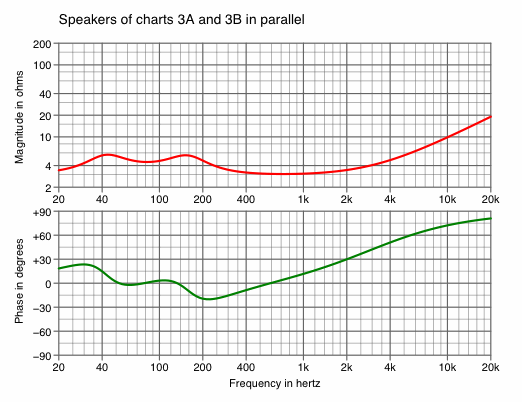 Chart 8A displays how the parallel connection largely eliminates any impedance spike at primary resonance, and reduces the phase angle in that region of frequencies. This results in a load that may be easier for an amplifier to drive. Still, caution must be observed with power handling, because at 40Hz speaker 3A presents an impedance magnitude of about 40 Ω and speaker 3B presents only about 6 Ω. Thus at this frequency 13% of current passes through speaker 3A, and 87% of current passes through speaker 3B. A similar phonomemnon occurs at 160 Hz. With such uneven distribution of current, hence power, the overall power handling is little more than that of one speaker.