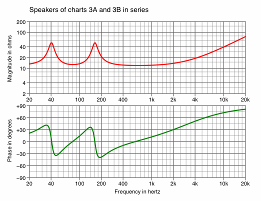 If two identical benchmark speakers are wired in parallel, the impedance curve will be the same as in chart 2A; in series, 2B. More interesting, however, is when two unequal speakers are connected, as in the example of charts 8A and 8B.