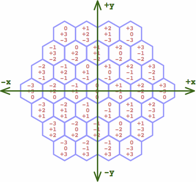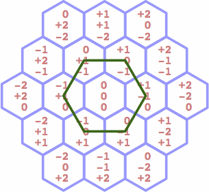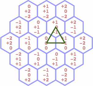 It is often helpful to establish a coördinate system so that each hexagon has a distinct identifier. Of course there is no end of possibilities, but one approach is the zero-sum integer (more briefly "zsi") scheme — all components are integers, and their sum is zero. This plan is redundant because it uses three numbers to identify regions on a plane, which is only two-dimensional. Nonetheless, the redundancy allows zsis to fully capture the symmetry of the configuration; a side benefit is that it sometimes discloses mistakes in calculation. Here is a typical layout, with a ceiling of 4: