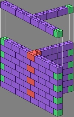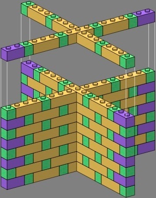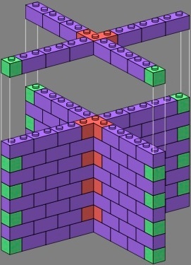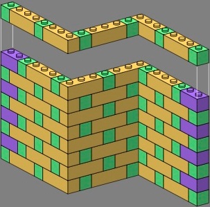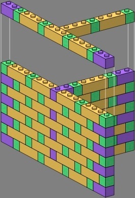 However, difficulties arise as soon as the juvenile builder tries a tee junction, and wants to solidly connect the two walls. Figure two shows one attempt, where three-course vertical joints (boxed in white) weaken the wall. Courses appear in cycles of four, but only three of them are different. Each smaller image on the right displays the core, consisting of the bricks immediately involved in the junction.