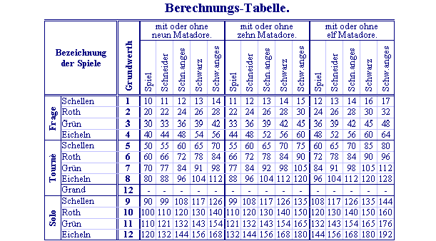 Tables of Skat bidding values.