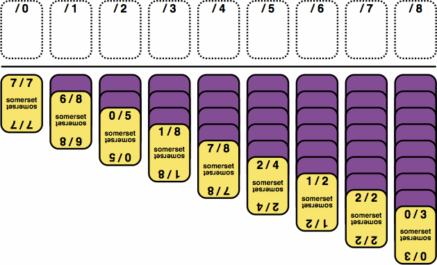 Each of the 28 cards used in the Single Somerset game is characterized by two numbers, written with a slash between: