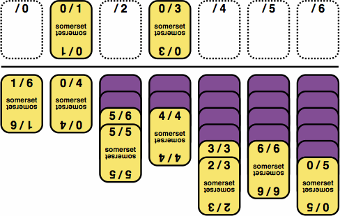 The resemblance to Dominoes is conspicuous. As with Dominoes, Somerset packs that go up to higher numbers have been produced, and this Klondike game can be readily adapted to use them.